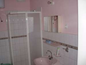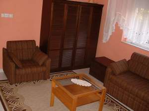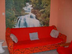Couchgarnitur für zwei Personen und ein Badezimmer mit Dusche und WC. Das Haus