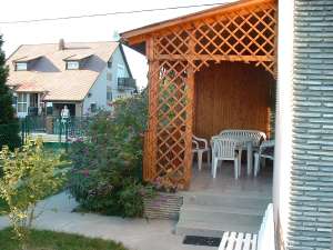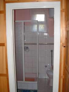 Badezimmer mit Dusche und WC. Zum Garten hin befindet sich eine überdachte