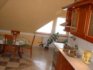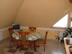 Hier möchten wir Ihnen 4 Luxusappartements vorstellen. Sie befinden sich in einem Geschäftshaus im Zentrum von Fonyod. Es ist eine lebhafte Gegend, zweimal die Woche findet dort der große Wochenmarkt statt, es gibt viele kleine Geschäfte, Cafe's und Boutiquen, Hafen und Strand sind in unmittelbarer Nähe. Das Geschäftshaus ist neu erbaut, im Erdgeschoß befinden sich kleine Geschäfte, ein Geldwechselbüro und ein Büro für Klimatechnik - keine gastronomische Einrichtungen. Es gibt einen großen Innenhof, indem die Gäste ihre Autos abstellen können. Haus und Hof sind mit einer Alarmanlage gesichert. Im Innenhof gibt es Grillmöglichkeit und Gartenmöbel, außerdem eine Vielzahl von Spielen wie z.B. Tischtennis, Tischfußball, Spielplatz, Swimmingpool: das alles steht den Gästen ohne Aufpreis zur Verfügung. Die Appartements haben Klimaanlage und Heizung. Bei einer Mindestbuchung von zwei Wochen organisiert der Hausbesitzer ein Tagesprogramm mit Yachtparty inkl. Essen und Trinken in den weltberühmten Weinbergen von Badacsony am Nordufer, als Geschenk für seine Gäste. Es gibt 2 Appartements für je 6 Personen und 2 Appartements für je vier Personen. Die Appartements für vier Personen mit den Katalognummern "FONYOD 13" und "FONYOD 14" sind folgendermaßen aufgeteilt: Anbau-Küchenzeile, neu und modern - E-Herd mit Abzugshaube, Kühlschrank, Mikrowelle, Wasserkocher, Kaffeemaschine, Toaster usw., dazugehörige Essecke; 1 Wohnzimmer mit TV-Sat und neuen Ledermöbeln, 2 Schlafzimmer mit Doppelbetten; 1 Badezimmer mit Badewanne und Bidet, 1 separates WC; im Eingangsbereich befindet sich ein Raum für Garderobe und Koffer. Alle Räume sind klimatisiert. Die Appartements für 4 Personen sind im Dachgeschoß und haben ca. 80 qm Wohnfläche. Hier können Sie unter der Katalognummer "Fonyod 13" ein Appartement für 4 Personen buchen. PREISE : Inklusive aller Nebenkosten, außer Kurtaxe - Achtung in der A-Saison beträgt die mindest Buchungszeit 1 Woche !!